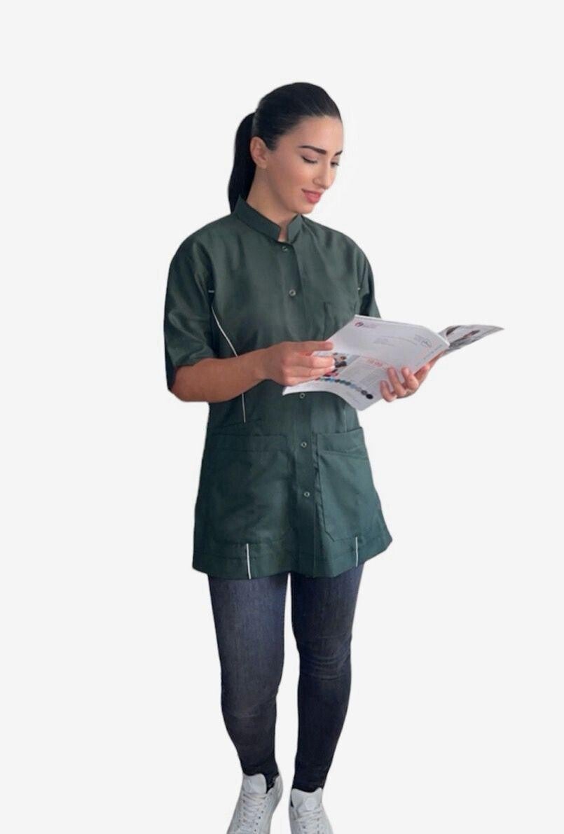 Of je nu werkzaam bent in een ziekenhuis, tandartspraktijk, of andere zorginstelling, deze zorgjas voegt een vleugje elegantie toe aan jouw professionele uitstraling.